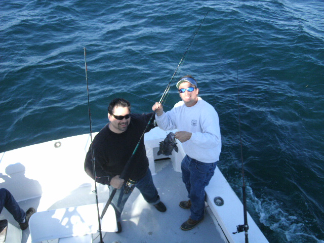 Checked the shoals in the morning for stripers none to speak of. We went onto the eastern reef, water temp 50 degrees. SEA BASS WERE BITING, BUT AS WE KNOW they are not in season. Had a great group, caught plenty of sea bass, dog sharks, released all of them, but for sure deep wrecks are loaded with bass would of had a limit if season was in. Rumors of the first bluefins being caught, but not confirmed. We have a group on standby watching the weather. We will get back to you soon. Will get reports from the deep soon…..Fun day, great job!