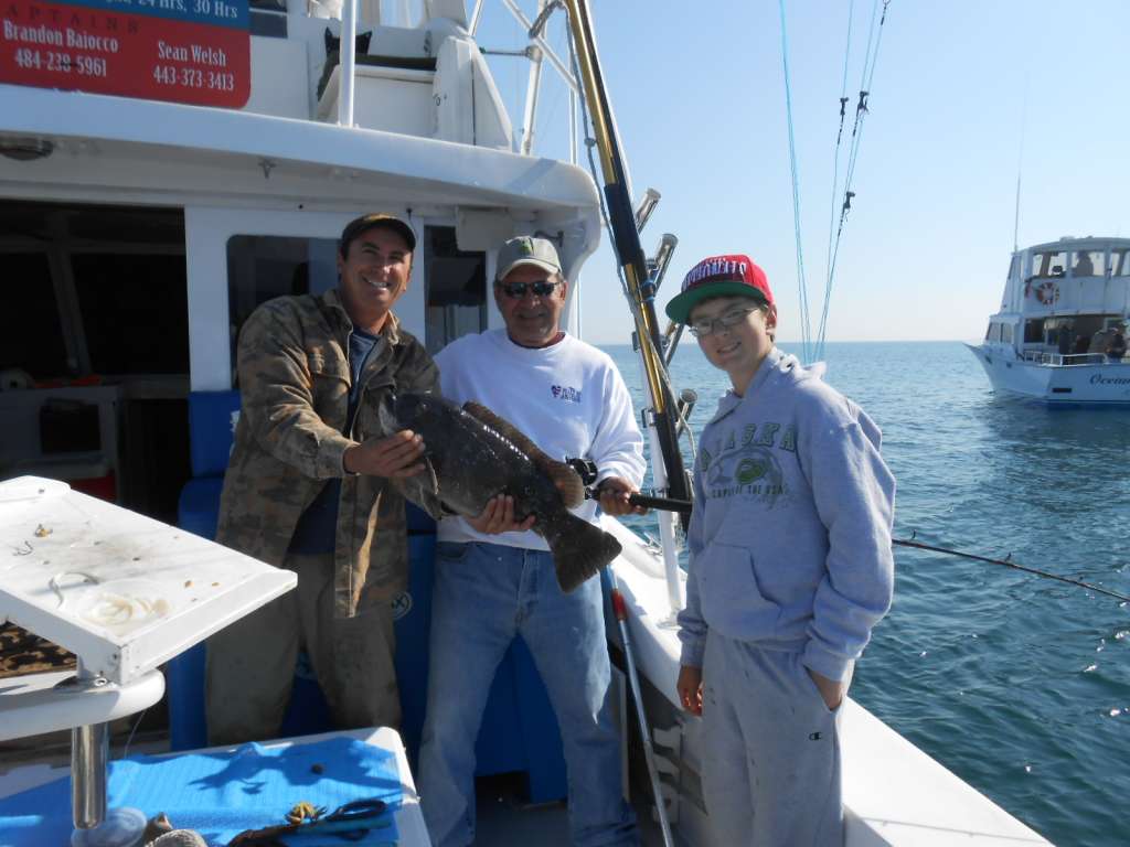 Capt.Todd took the 1st trip of the season to the African Queen wreck-half day charter with Halamandaris family Larry,Bill,Will ,,,Had great weather caught some fish and produced a nice Taug measuring 25 inch 13-14 pounder….