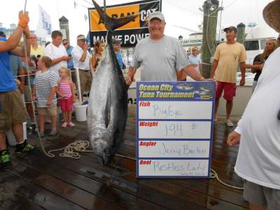 TUNA TOURNAMENT- fished Friday had no tuna bites at the bigeye hole along with 70 other boats, had 3 white marlin encounters on our heavy gear with no luck, weather was almost too pretty …. Back at it on Saturday- same slow bite ’till about 12 noon with a little cloud cover. We had a couple marks, made turn up and back down the hill, got a nice 55# yellowfin on a Capt. Joes fishfinder. Made another pass and crash, got him on, in 35 minutes a 194 bigeye in the boat. Had our regular tournament team on the boat. Holding on to 1st place sat night,,,last 10 minutes on Sunday knocked down to third place for largest single fish….Great Fish, great crew, we’ll be ready for WMO.