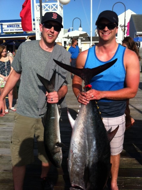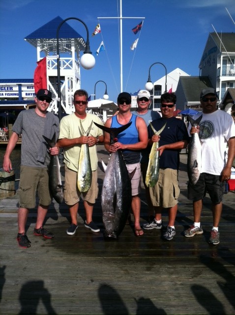Finally back out in the ocean, Restless Lady along with the fleet worked a couple miles north of the Hotdog finding the bluefin tunas had some over 47″ along with some other bites- Bluefish, Mahi and Yellowfin… fleet reported scattered yellowfins and bluefins at the Hambone , Masseys and Hotdog. Had a great crew, was nice to get out. Bluefin we put on the dock was 128 pds.