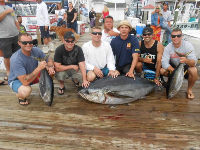 Captain Todd started with the fleet in the South Poormans, very slow for everyone so started paddling towards Washington canyon, had some small yellowfins then had a big bite and yes sir a nice big-eye at 228# for a great crew from USCG station Ocean City, MD. Congrats to Devon!!!!!! The fleet did well in Poormans in the afternoon with better yellowfins. We are fishing everyday thru Sunday, we’ll keep you updated.