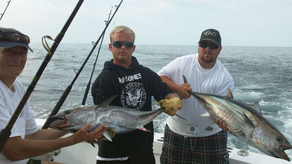 Alright, here we go! Restless Lady had a great crew, the Dewitt family, the crew of them reeling and reeling. Released 30 bluefins from three different spots. The whole family had a great day. Plenty of bait around. Capt. Todd decided to drop a spoon down and in 20 minutes caught 2 dozen tinker mackeral in 100 ft of water, which is a little strange to see. Back at it tomorrow. Today fish were 35″-46″ all day.