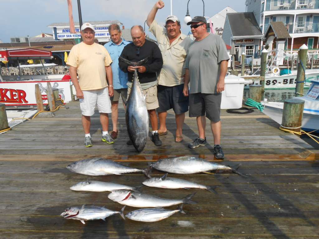 Capt.Todd and Brandon initially were headed to the Baltimore in rough water but pulled up short and had to pound it out at 30 fathom line outside the Dog. Bluefins everywhere ,8 tuna bites,yellowfins where mixed in w /bluefins,…
