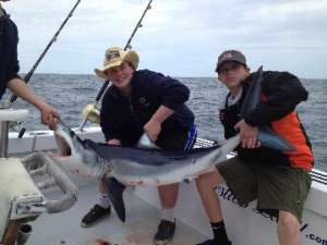 We landed 2 fat Blue sharks and one keeper Mako. All hit bluefish fillets.