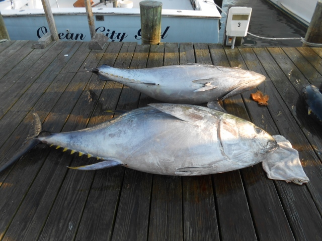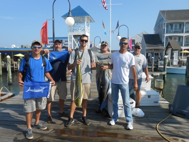 Returning to the dock on Wed with 310 pd and 227 pd Big-eye and 23 yellowfins. Restless Lady sat on Thursday, Friday out on a day trip seemed for most all of the boats things were slowing down, water in the Norfolk to south Poormans turned green in color at 69 degrees, scattered longfins, a few yellowfins, some white marlin were caught. Friday day trip for us was chunking until 11am no bites, did some trolling producing a handful of dolphin and a 60 pd Wahoo. Saturday we the left dock at 10 am and trolled until dark. Poormans producing a couple white marlin for us, the fleet reports some boats had as many as 12 longfins. Night was slow producing some blue shark action with a small mako, Morning trolling produced another white, nice blue marlin that put a great show on, nice gaffer. Reports from the north, Spencer with some nice yellowfins on troll and lonfins on chunk…swordfish action with water screaming our way …going to blow this week ought to put fish in our backyard.