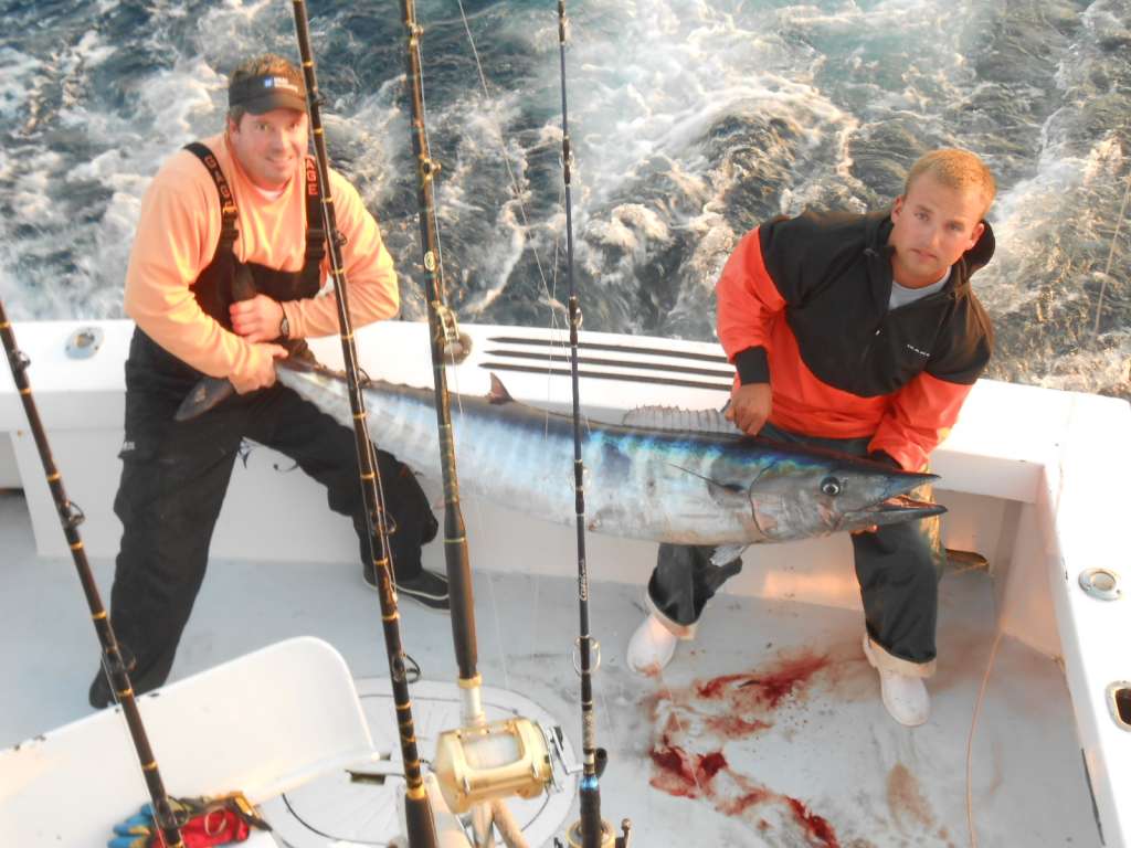 Capt. Todd and Brandon off to the Lindy Friday morning. Had nice ride, started trolling and missed a wahoo and a big gaffer on the way and got set up for the night. Slow with 60 boats, some got the bites, some had nothing, did not mark a fish until 3am, had flurry, cut a couple off in longline gear and pulled a couple off but manage to hold on to some from 67# to 76#. Trolling out of canyon in morning had a monster air out on bait and 93 pd wahoo was the result.