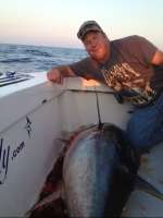 We set up our chunk at 9pm for the yellowfins. Immediate hook ups and it didn’t stop until our limit of 28 keepers plus releasing another 15 and finally calling it quits at 1230am. They ate butterfish and were not picky, just hungry. All nice size fish between 20-40#s. Big hammerheads crashing the slick looking for an easy dinner of tuna.